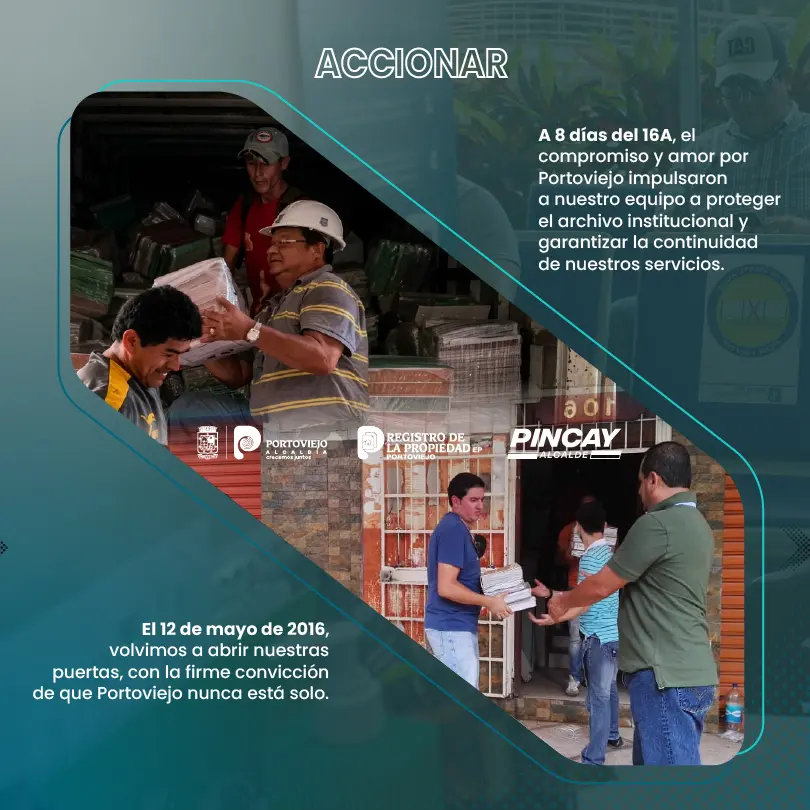 Apenas ocho días después del 16A, cuando la incertidumbre aún marcaba cada rincón, el compromiso y el amor por Portoviejo impulsaron al equipo del Registro de la Propiedad a proteger su archivo institucional, resguardando la memoria jurídica de la ciudad y garantizando la continuidad de un servicio esencial para la ciudadanía. Fue un acto silencioso, pero decisivo: preservar la historia para sostener el futuro.